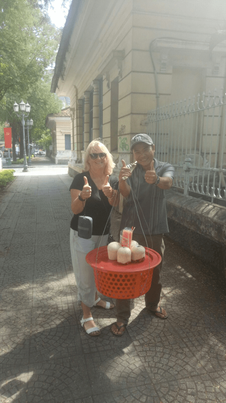 After our hurried wander through the palace we were scammed over coconuts. Now let me be clear, we don’t like coconuts. Also let me state clearly that we were warned by Sunny about this type of scam. But we let our guard down and got caught out. It started with the coconut seller helping us to cross a busy road. The Newby was more alert than me, who said “he’s helping us across the road”. The vendor then engaged us in conversation, albeit it broken English, before letting The Newby try the coconut carrying device and then insisting on a photo with me. He then extracted a coconut, cut the end off it, shoved a straw in it and did the same with a second coconut. At this stage it occurred to me he wasn’t being nice and now expected us to pay for them. Ok, no problems. At this point though it all went odd. I couldn’t understand the price, I didn’t have my glasses on and I made the fatal mistake of taking all the notes out of my bag. Like a true conman the seller stayed calm, convinced us the coconuts were 15000 each but managed to stick his hand in among the notes and fleece us for 300000 dong. He kept me distracted by keeping on talking before packing up and heading away. I was so confused by everything that I didn’t realise what had happened until he was long gone, in the direction we came from. Bastard! No other way to describe it. The bit Sunny warned us about was the notes. However the coconut scammers are a well known thing in Saigon. Too bad we didn’t know before we paid $18 for 2 coconuts we didn’t want! Bastard!