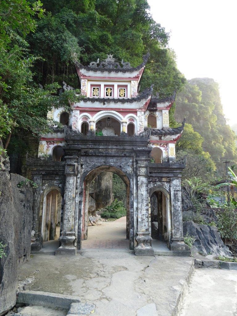 We arrived here by scary tourist limo. The traffic is stupid but the driver behaviour is just plain nuts. For instance, our driver stopped in the middle of the dual carriageway, under an overhead road. He jumped out of the vehicle, over the concrete barricade and ran across three lanes of traffic to grab something from another a vehicle. Meantime 9 of us are sitting in a vehicle parked up in the middle of a freeway! We did make it safely to Tam Coc where we were unceremoniously dumped from the limo onto the street with our baggage, 800m from our accommodation. After having something to eat and a beer we grabbed a Grab and made it to the Palm House. After check in Thom gave us the information on the things to see and do in the area and lent us a bike each to head off to Bích Dong Pagoda. Because her dad works there (maybe) we didn’t have to pay the bike minding fee. In fact he was really delighted to see us and parked the bikes for us!