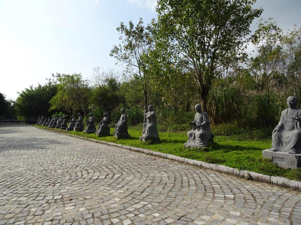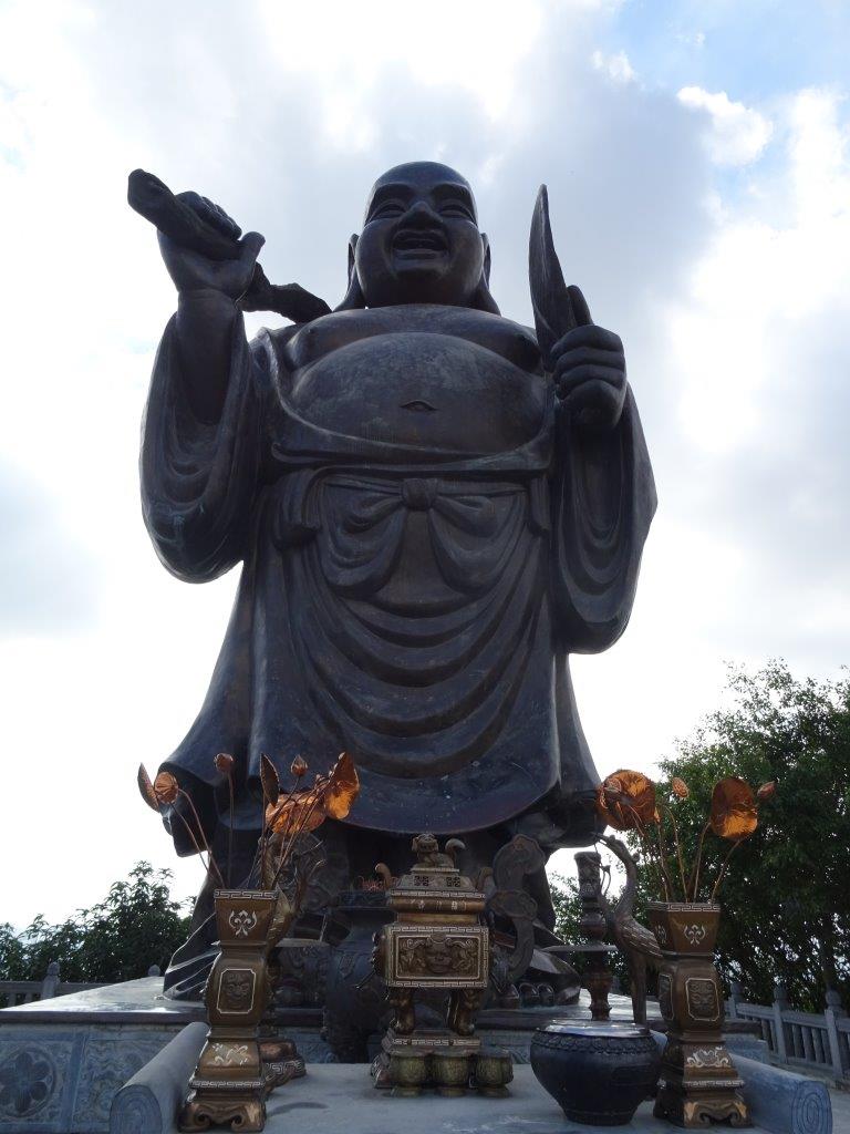 Actually it is a nice place to spend a while. The pagodas get successively larger as you walk through. The signage indicated that we weren’t to take photos inside so we respected that. We were the only ones who did. There is also a very high Pagoda and a great statue of a fat fellow headed on his way with his baggy on his back. There are simply thousands of gold statues about a foot high, all exactly the same, that are built into little recesses everywhere. They have a strip of paper that includes a number, what looks like a name, and some other information. There are also many hundreds, if not thousands of stone statues, 8 to 10 feet high that line the sides of the covered walkways. They go literally as far as the eye can see. Some look happy, some look mad, some look like they are victorious and others look scholarly. As for the pagodas, they are massive, with shimmering gold Buddha and other statues, 20 meters or more high. People are there worshipping but then quickly bust out their phones and take a million pictures, including the selfies, before traipsing off to the next spot.